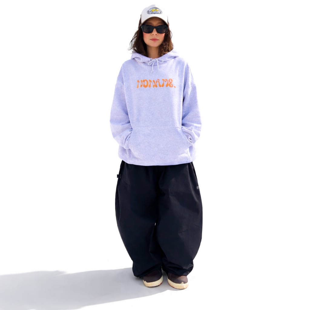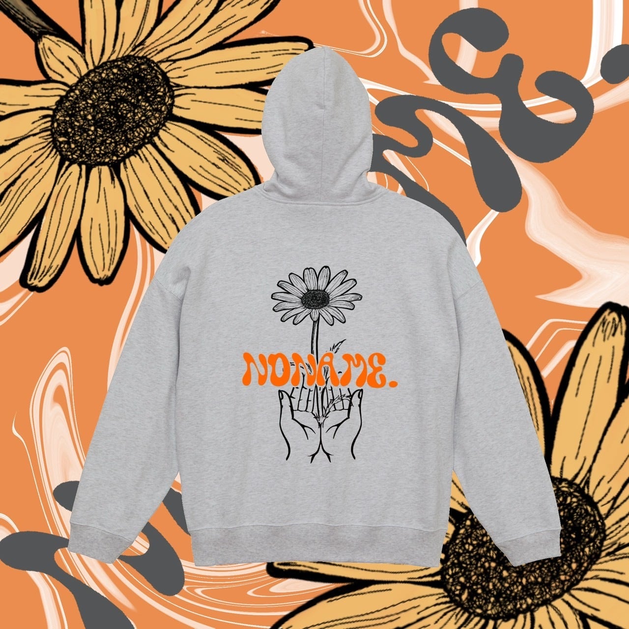 手のひらから一輪の花が咲く、メッセージ性あふれるバックプリントデザイン。繊細なモノクロイラストに、ビビッドなオレンジの「NONAME.」ロゴが重なり、ストリート感とアート性を両立した一枚に仕上がっています。