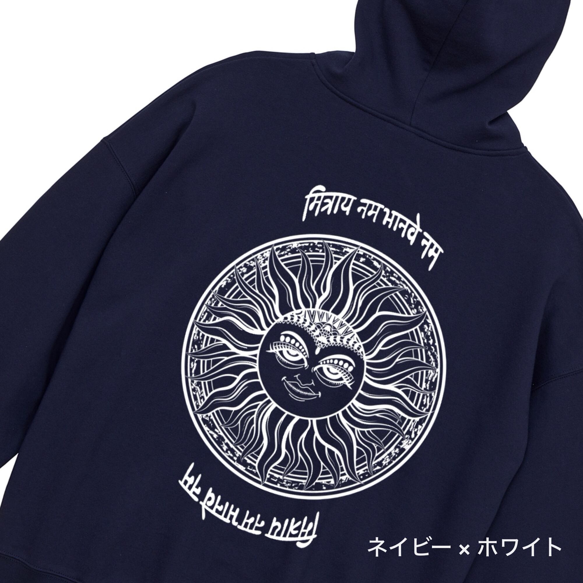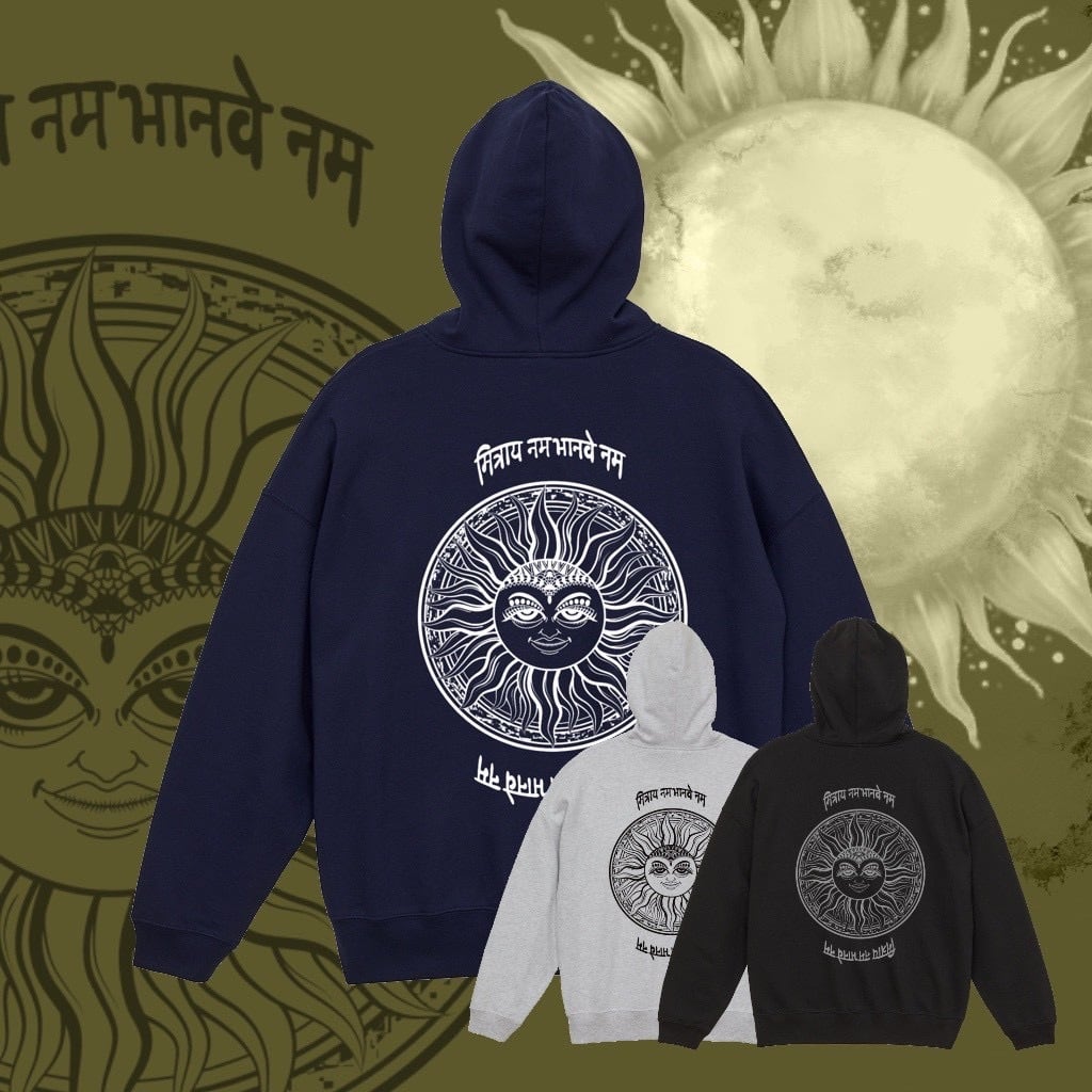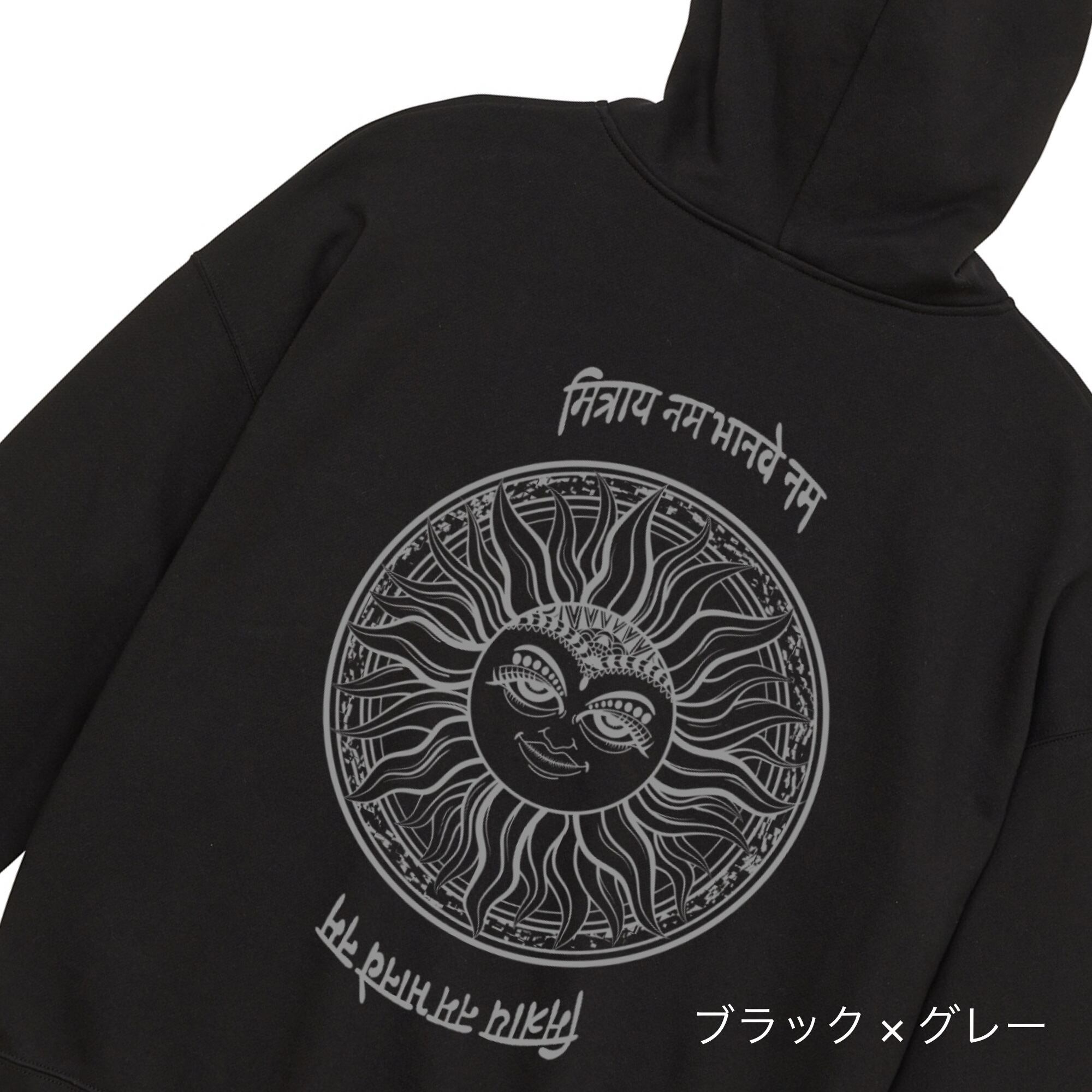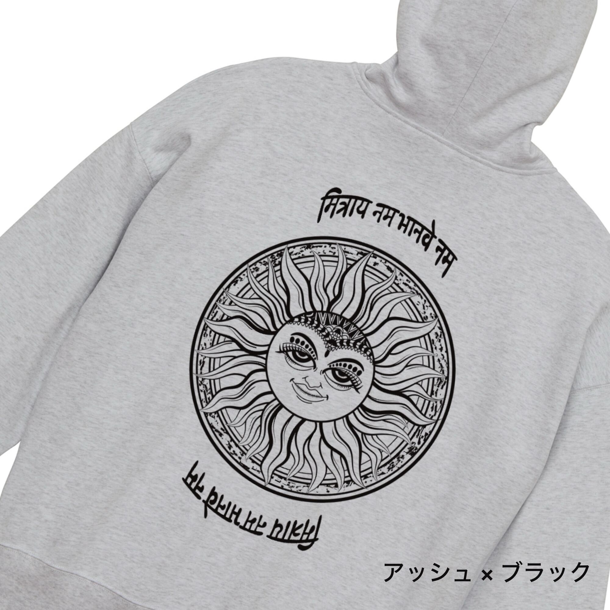 神秘的なサンモチーフを大胆に背面へ落とし込んだ、ビッグシルエットのプルオーバーパーカー。繊細なラインで描かれた太陽のグラフィックと異国風の文字デザインが印象的で、アート性とストリート感を兼ね備えた一枚です。シンプルなフロントとの対比により、バックスタイルが際立つデザインに仕上がっています。