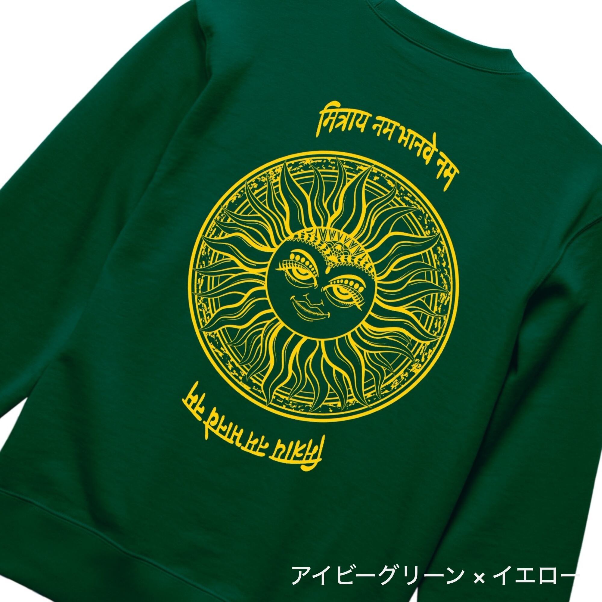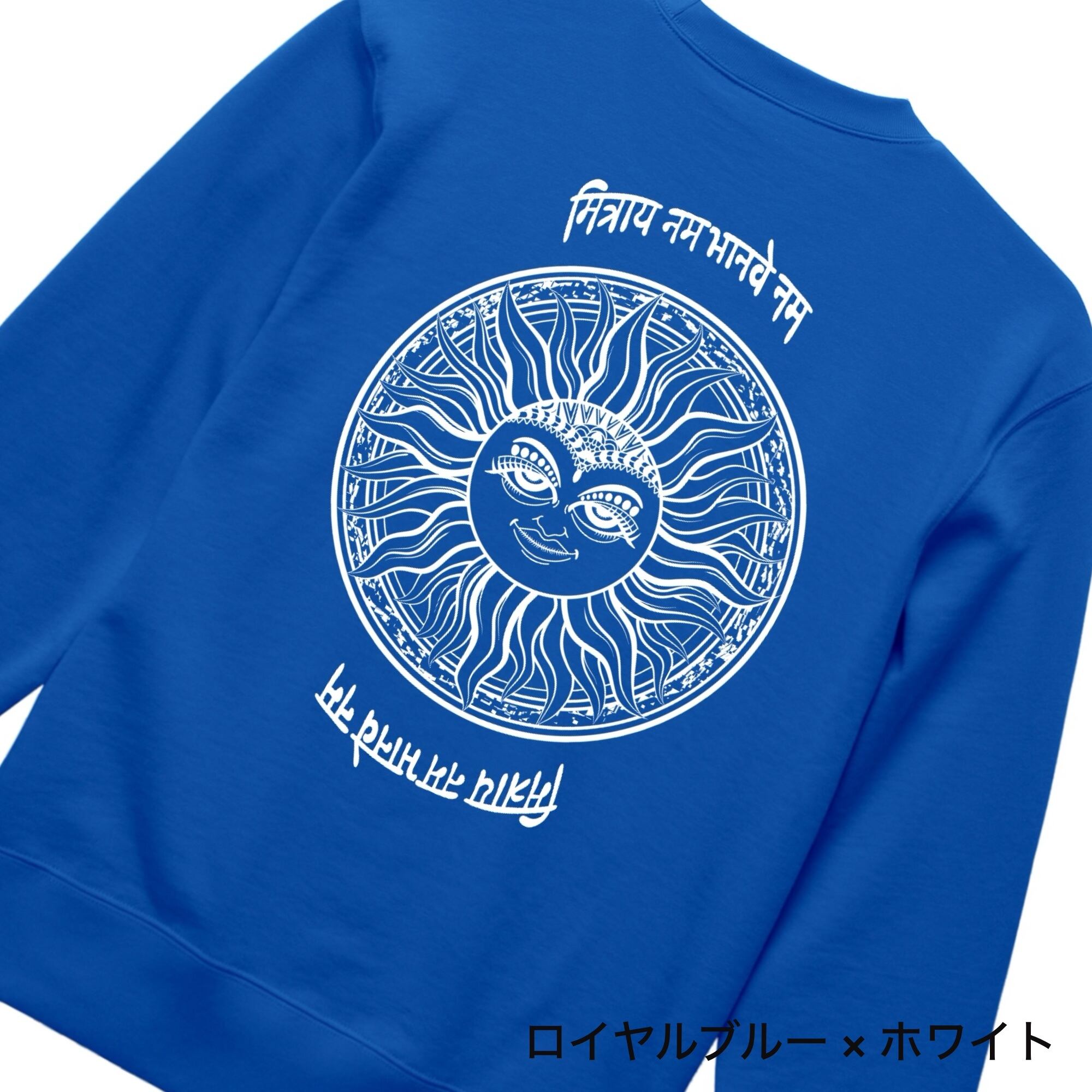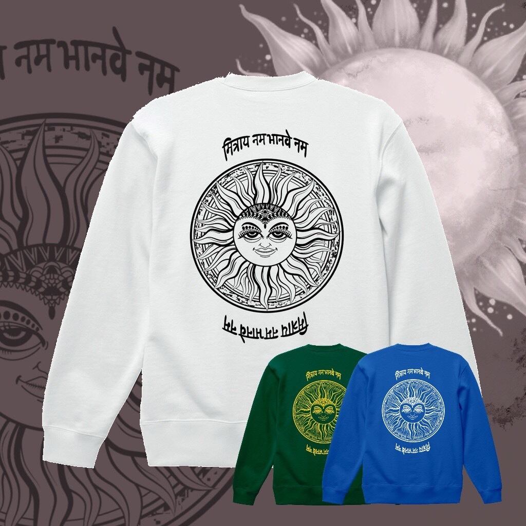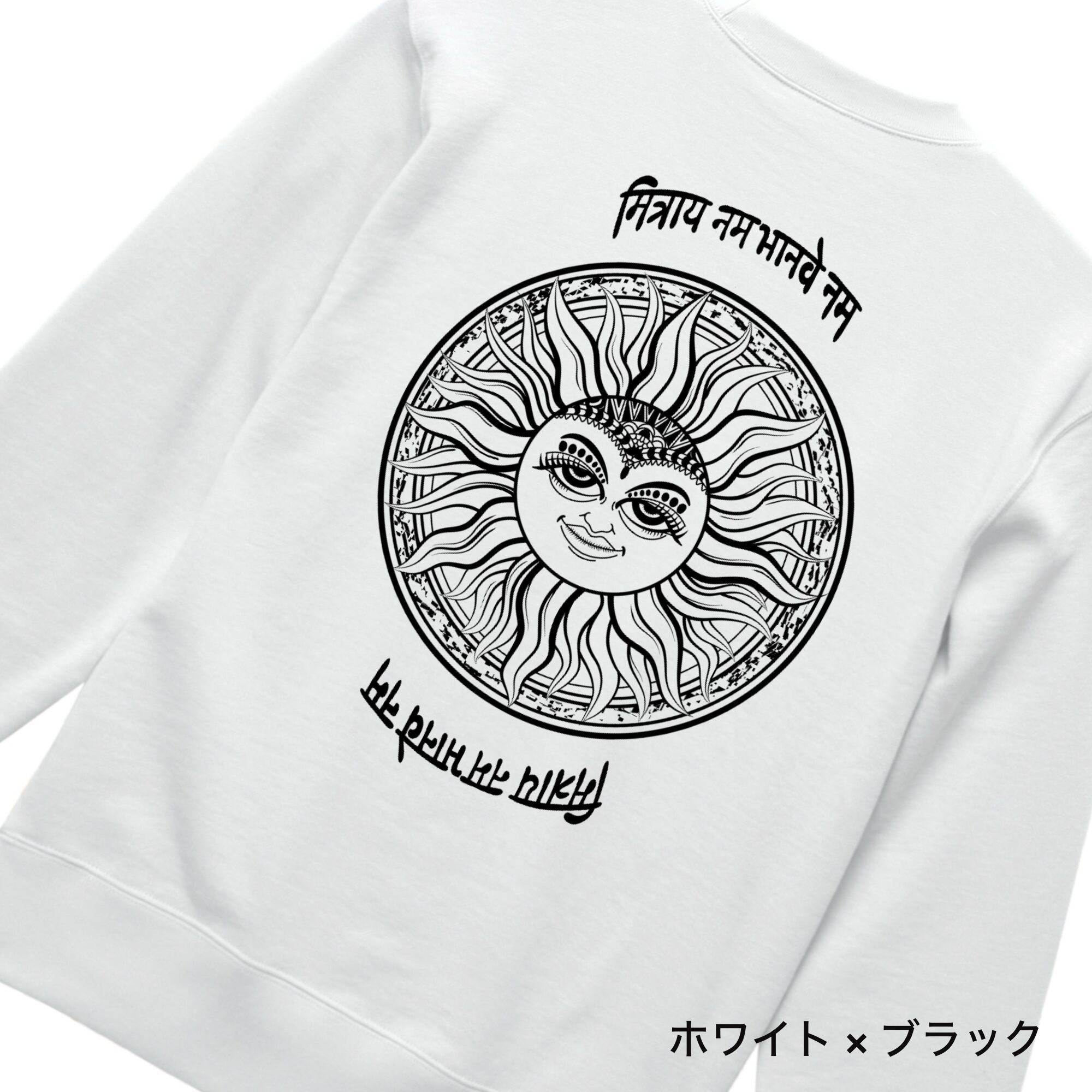 神秘的なサンモチーフが印象的な、存在感あふれるクルーネックスウェット。背面には細密に描き込まれた太陽のグラフィックと、異国的な文字デザインを大胆に配置し、アート性とスピリチュアルな雰囲気を融合させた一枚に仕上がっています。シンプルなフロントとのコントラストが、バックスタイルをより際立たせます。