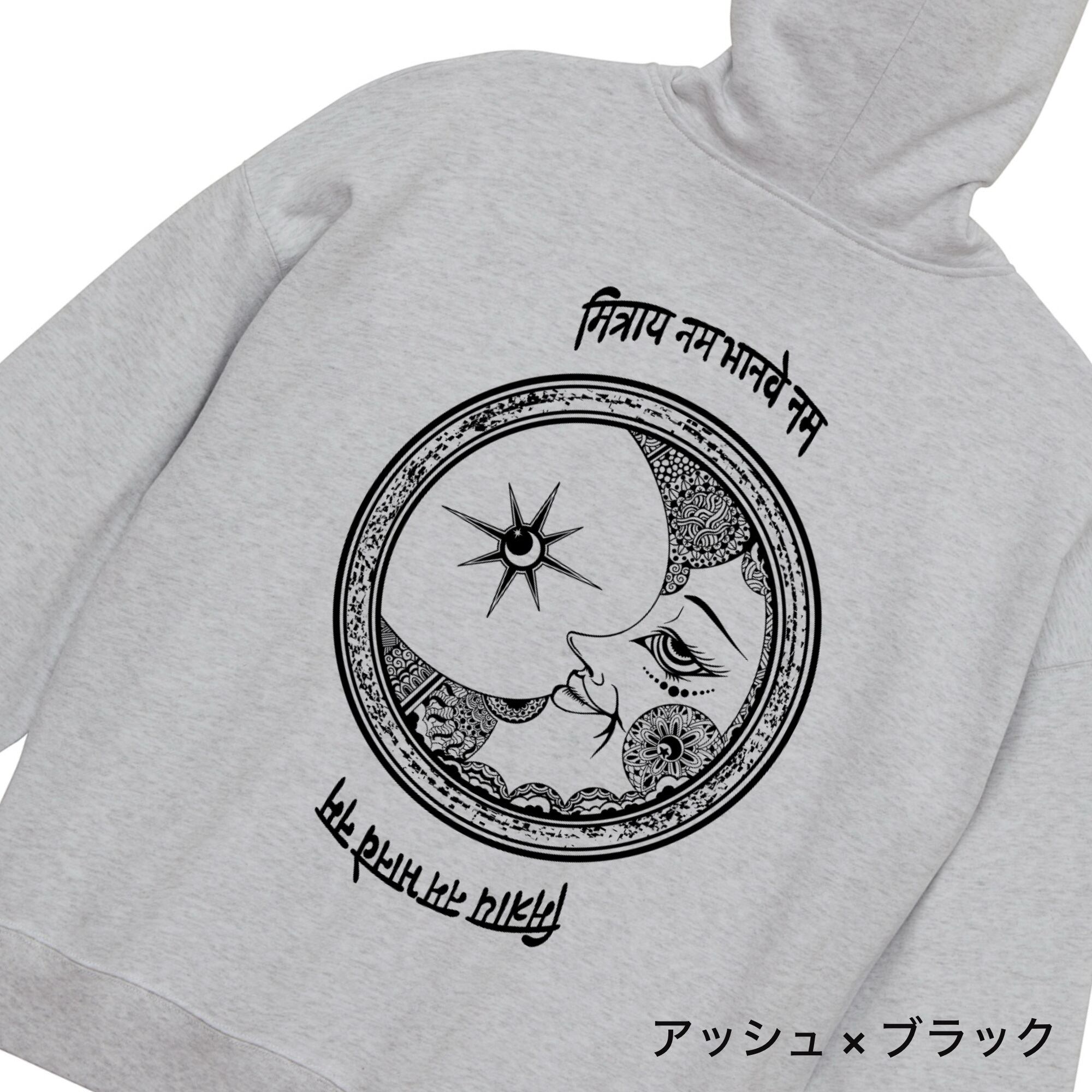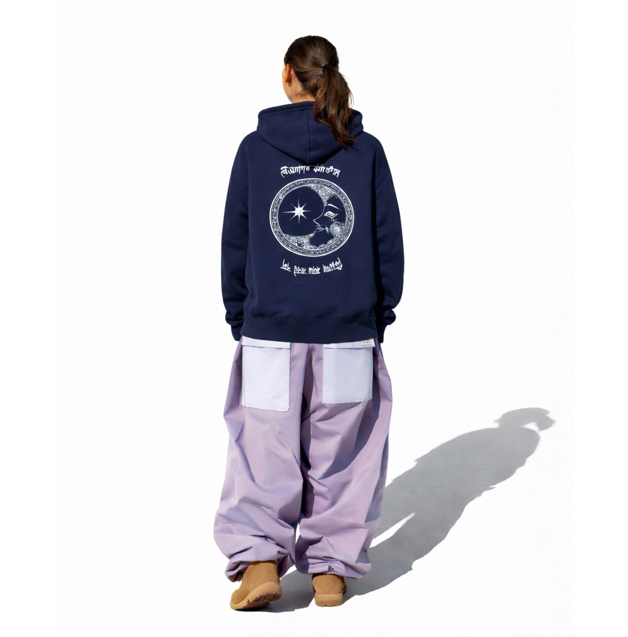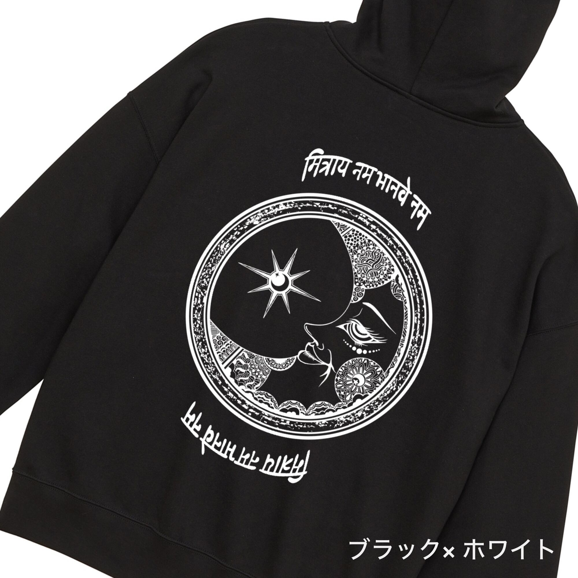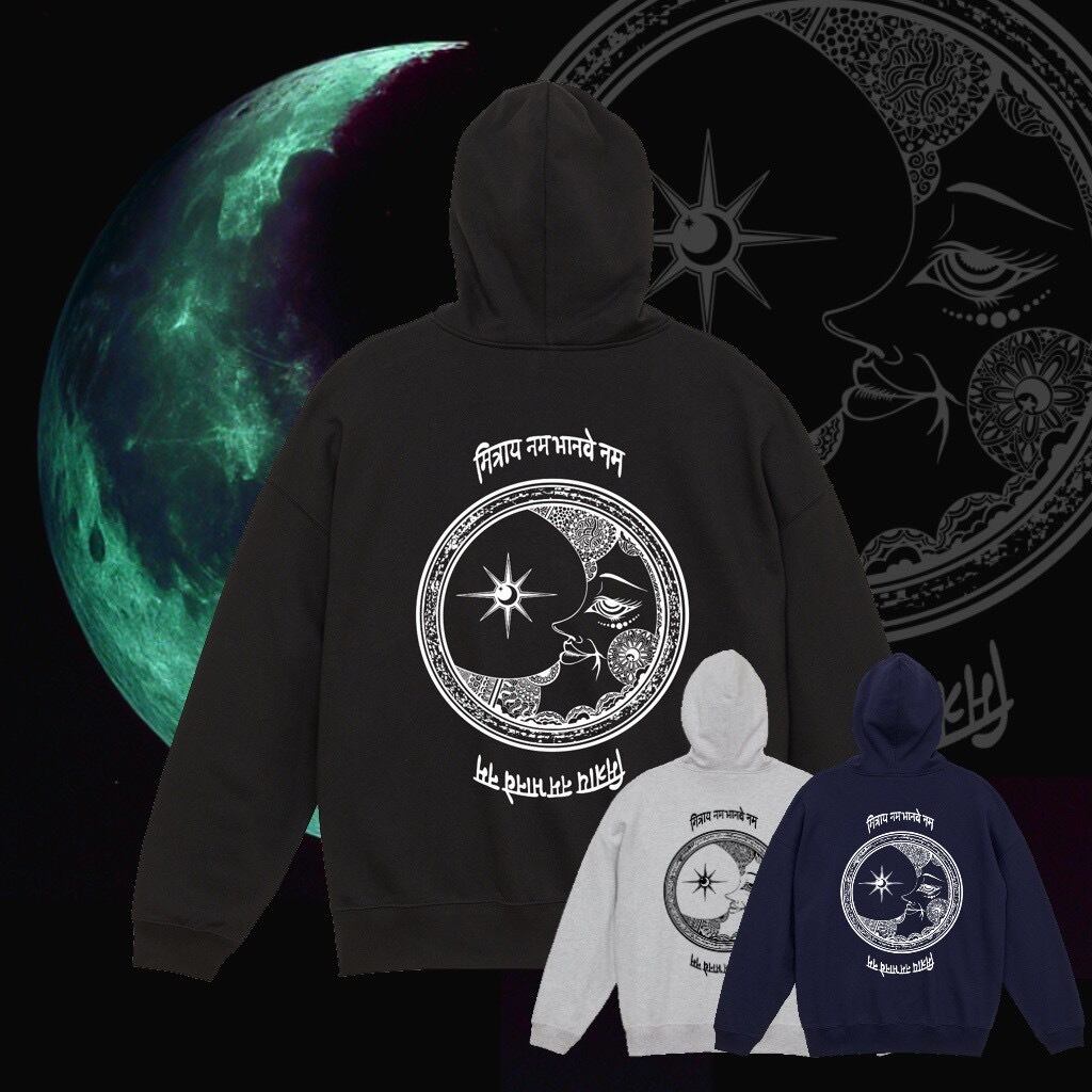 幻想的な月のサークルアートを大胆に背面へ落とし込んだ、ビッグシルエットのプルオーバーパーカー。繊細なラインで描かれた月の横顔と星、装飾的なフレームデザインが神秘的な世界観を演出し、ストリートとスピリチュアルアートを融合させた存在感のある一枚に仕上がっています。