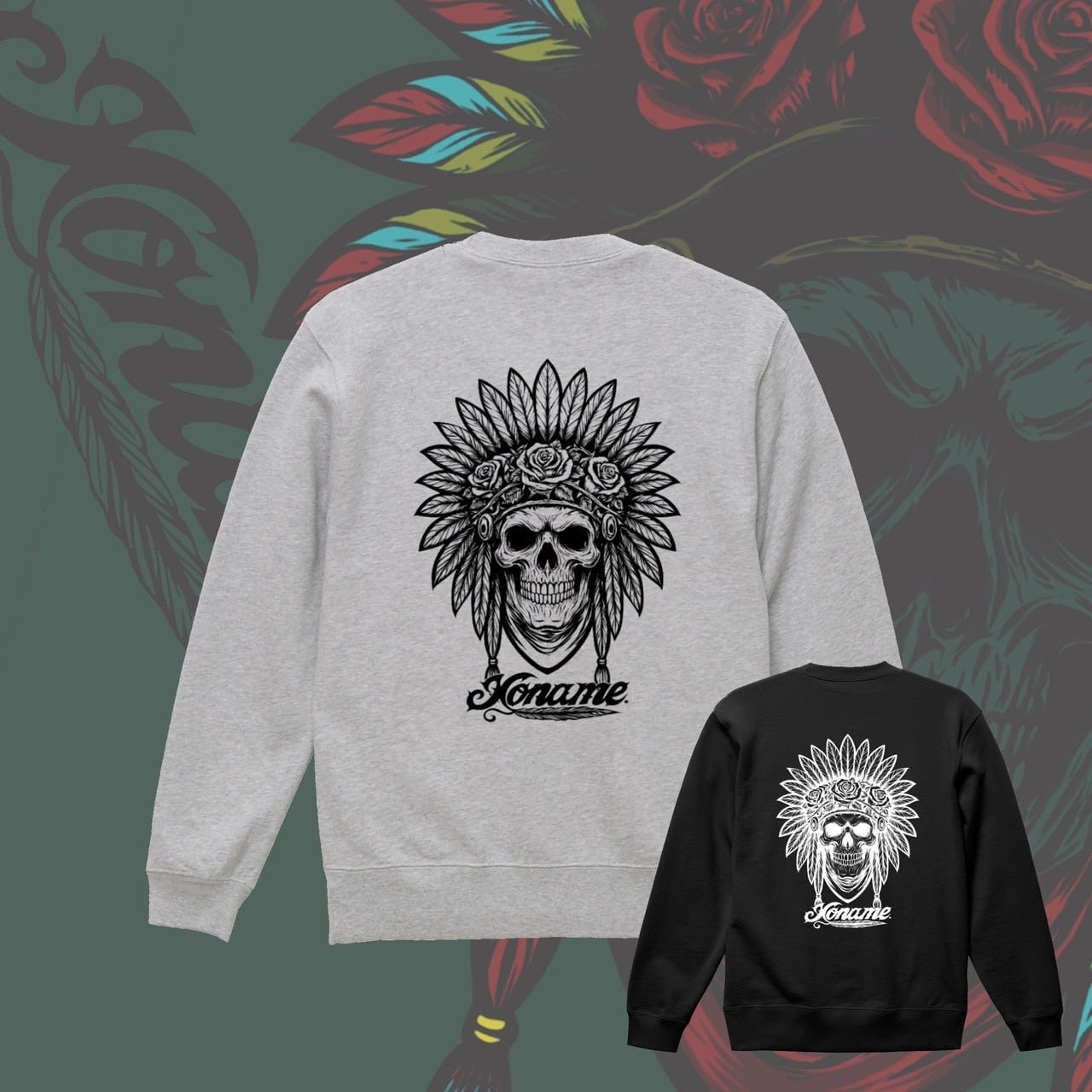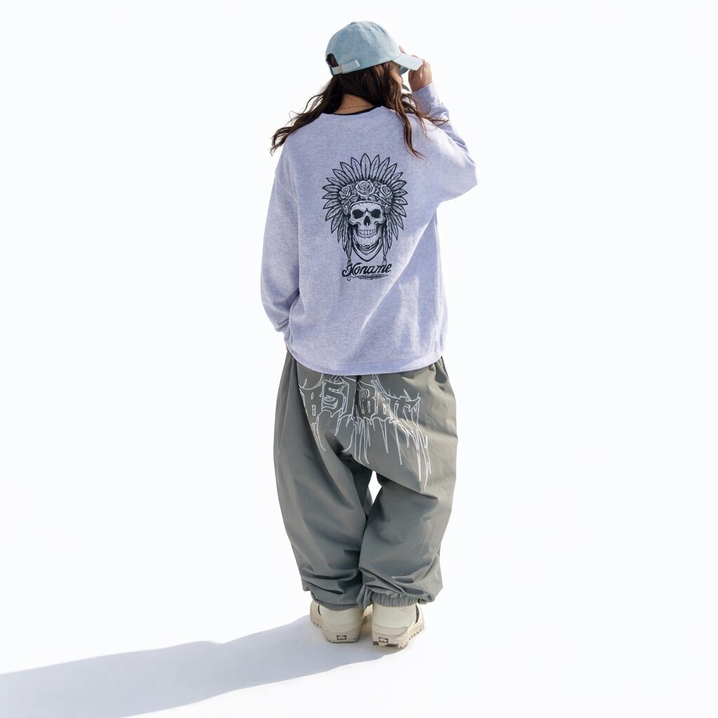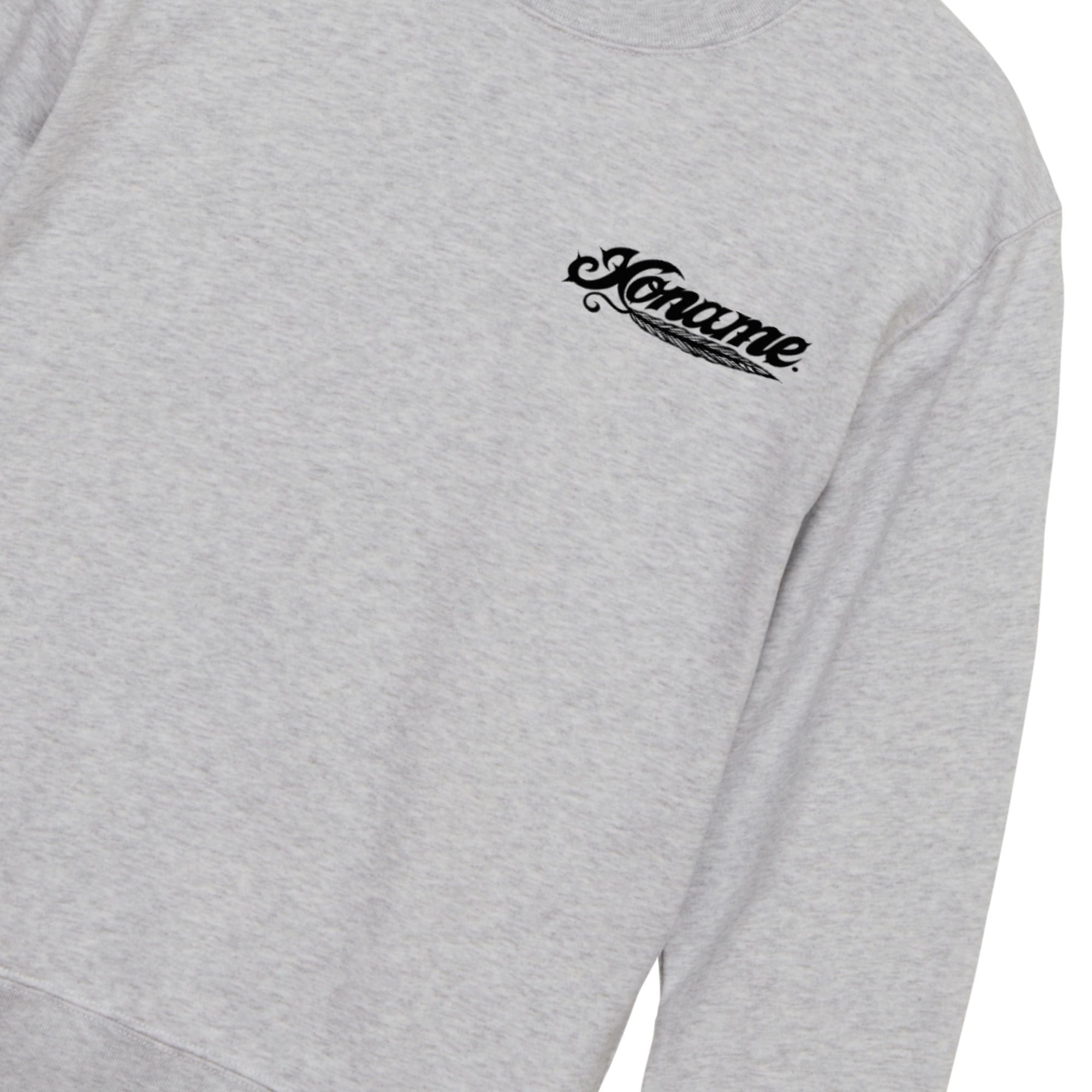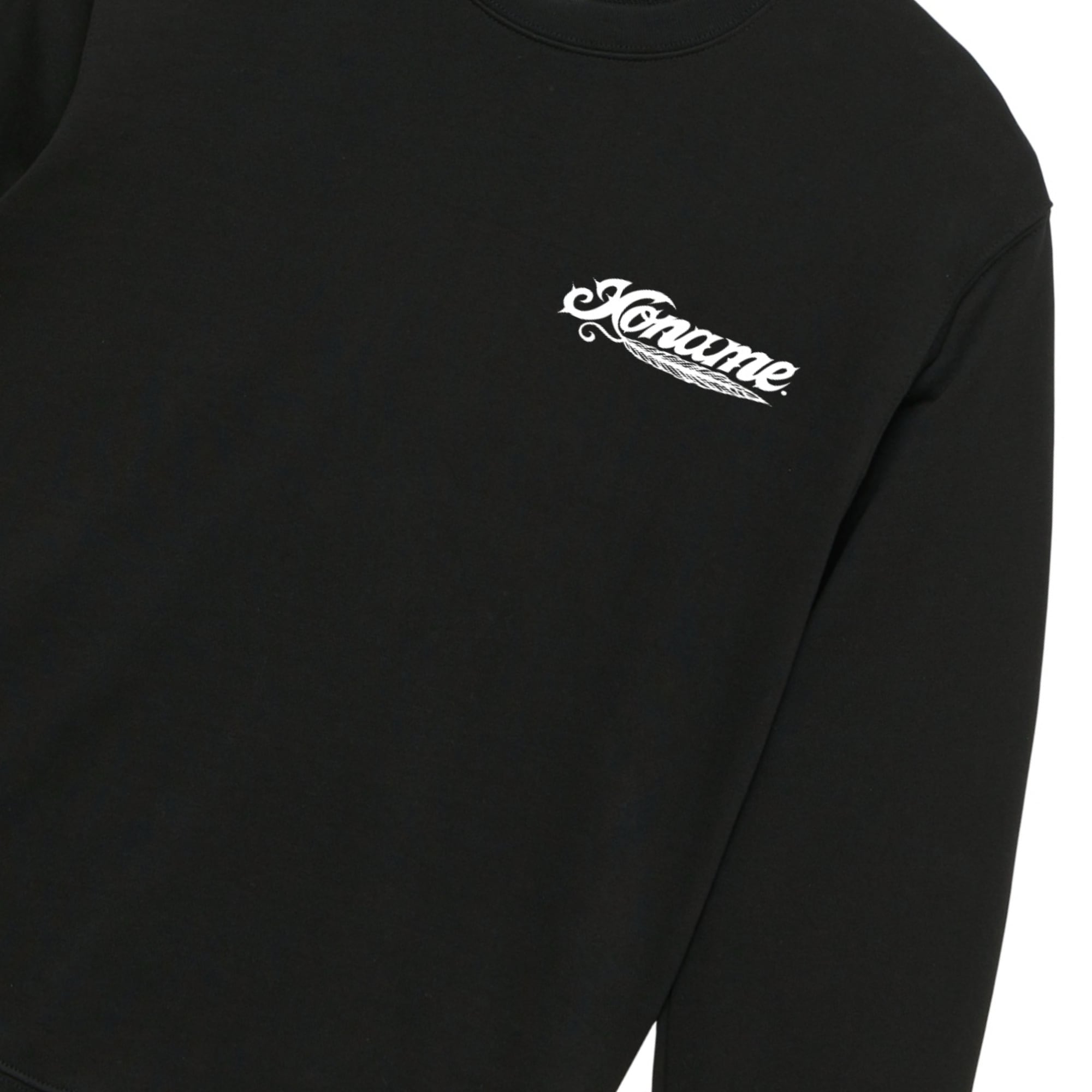 インパクト抜群のスカル×フェザーモチーフを大胆に背面へ落とし込んだクルーネックスウェット。羽根飾りとローズを組み合わせた繊細なモノクロアートが、重厚感とアート性を兼ね備えた存在感のあるデザインに仕上がっています。下部には「Noname.」ロゴを配置し、世界観をより強調。