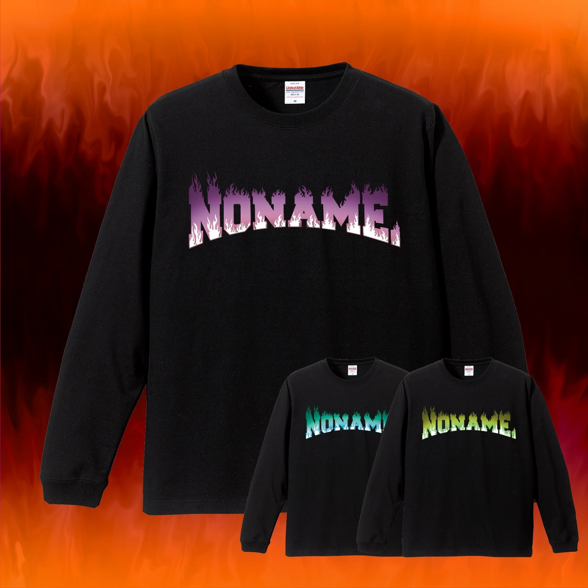 フロントに大胆なフレイムロゴをあしらった、存在感抜群のロンT。炎をまとった「NONAME.」ロゴがインパクトを放ち、ストリート感あふれるエッジの効いたデザインに仕上がっています。ブラックボディに映えるグラデーションカラーが、コーディネートの主役に。