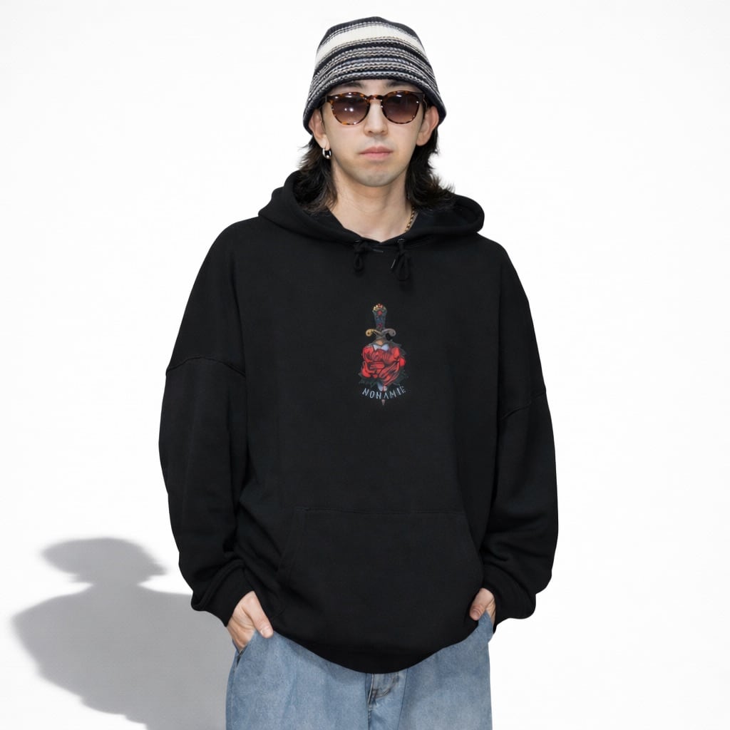 クラシックなモチーフが映える、存在感のあるロングスリーブTシャツ。胸元には短剣とローズを組み合わせたワンポイントグラフィックと「NONAME.」ロゴを配置し、シンプルな中に程よいアクセントを効かせたデザインに仕上がっています。